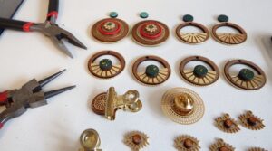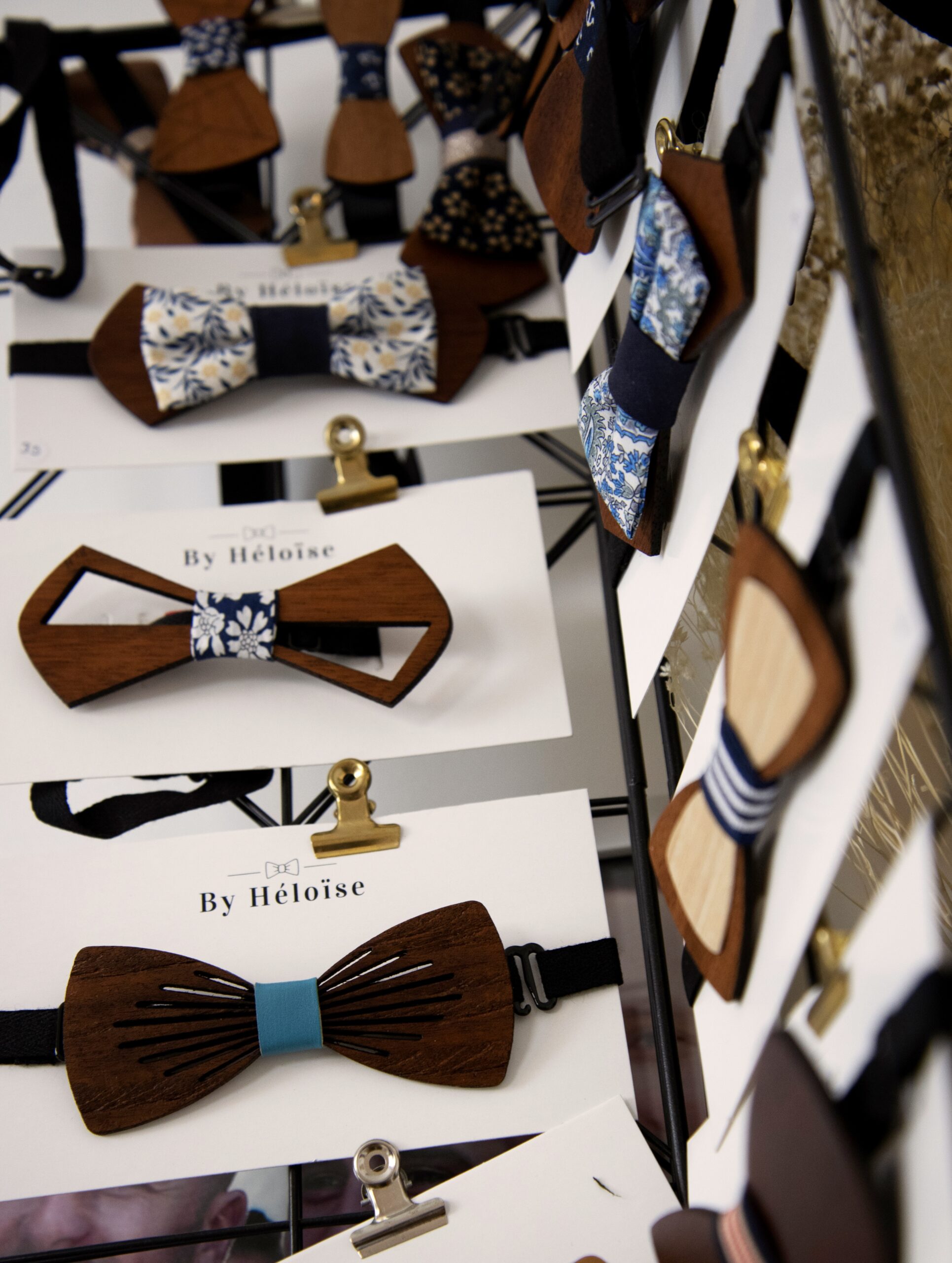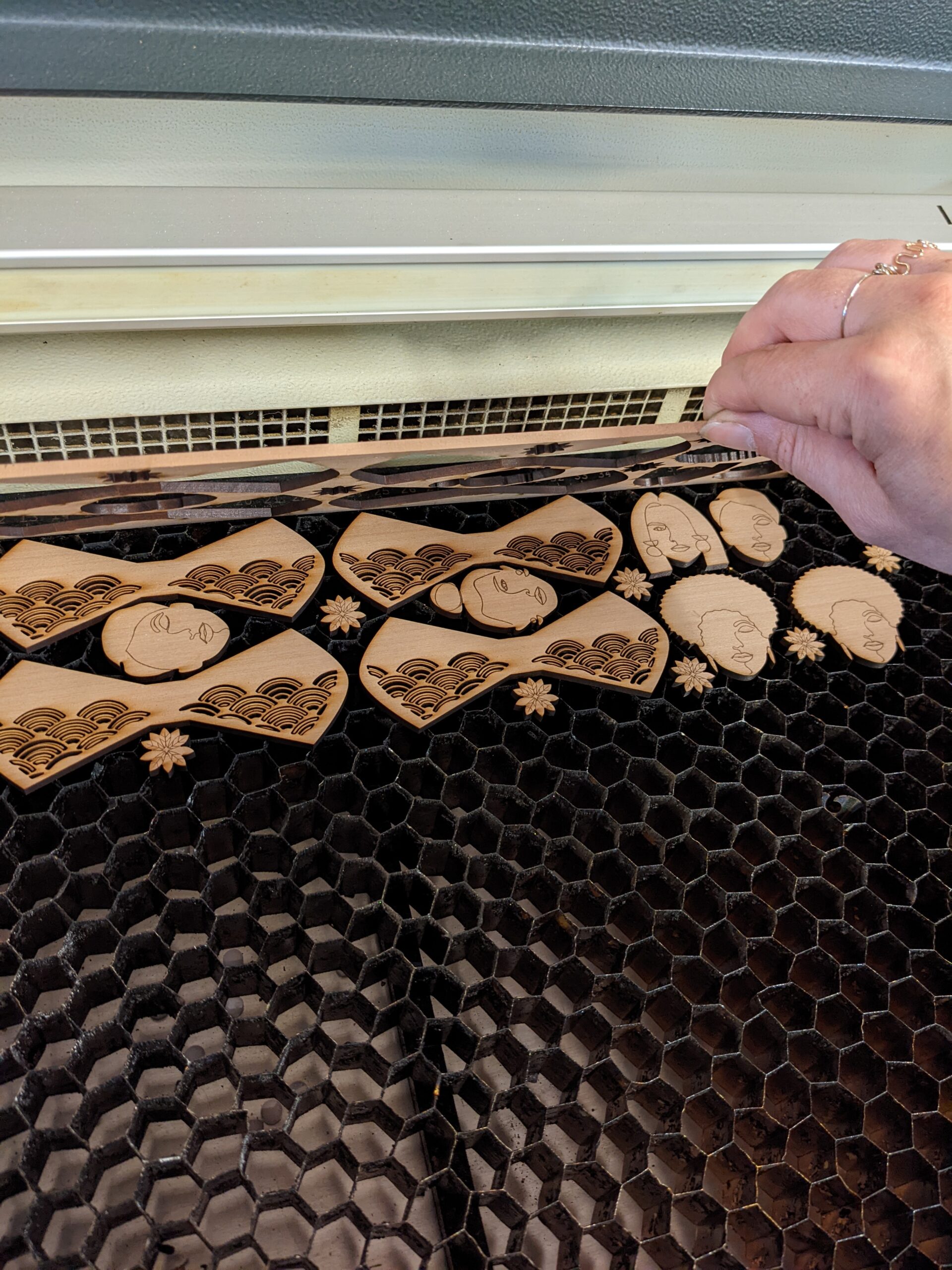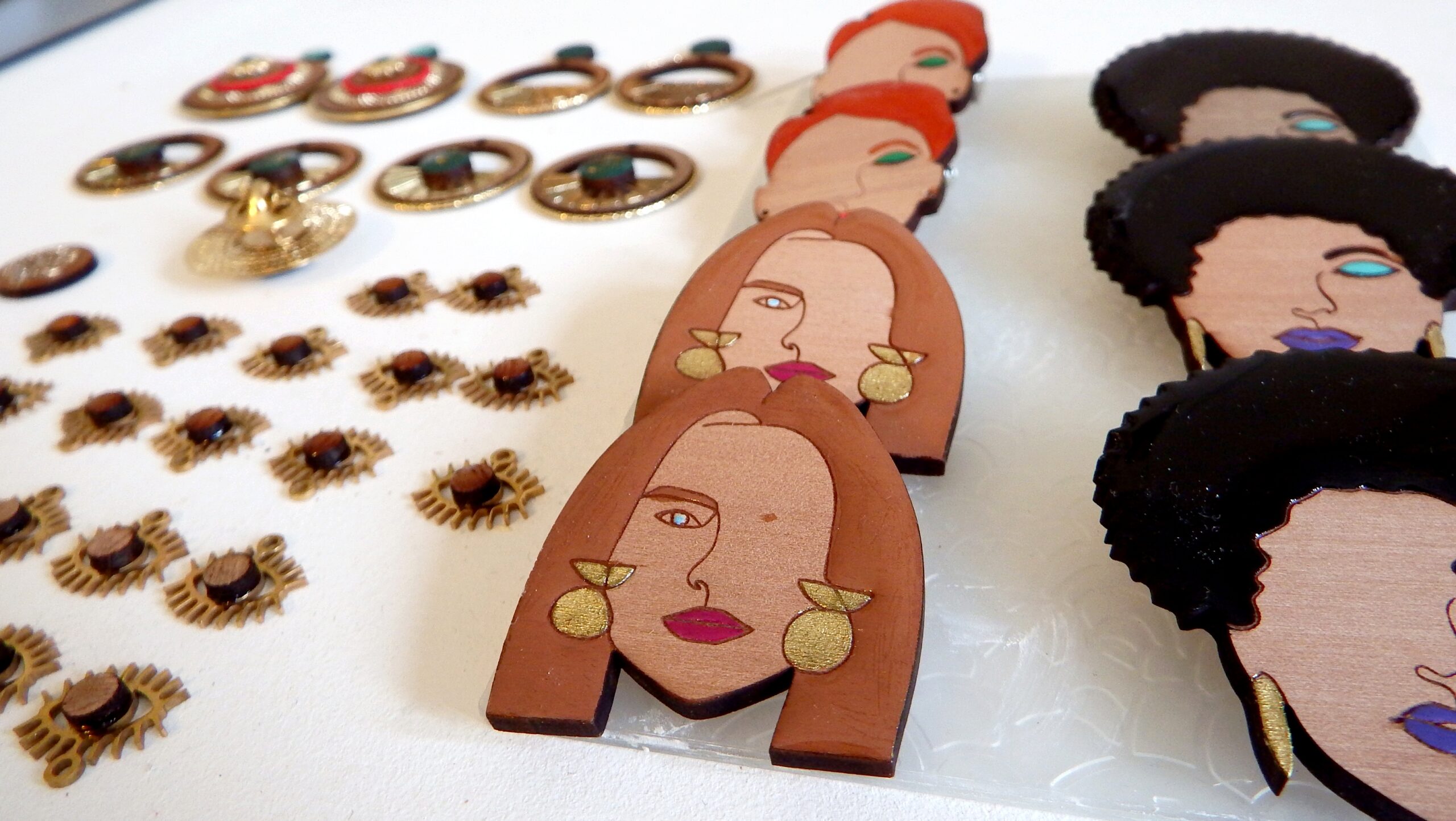 Cet outil permet une découpe de précision et permet de donner vie à tous mes dessins et à vos projets personnalisés. De plus, la brulure que laisse le laser sur le bois apporte une touche de finition que j’apprécie énormément. Une fois découpées, les pièces sont ensuite, poncées, teintes, vernis et assemblées à d’autres matériaux pour devenir des bijoux et noeuds papillons. J’aime l’idée que mes produits soient un mariage d’artisanat et de nouvelle technologie.