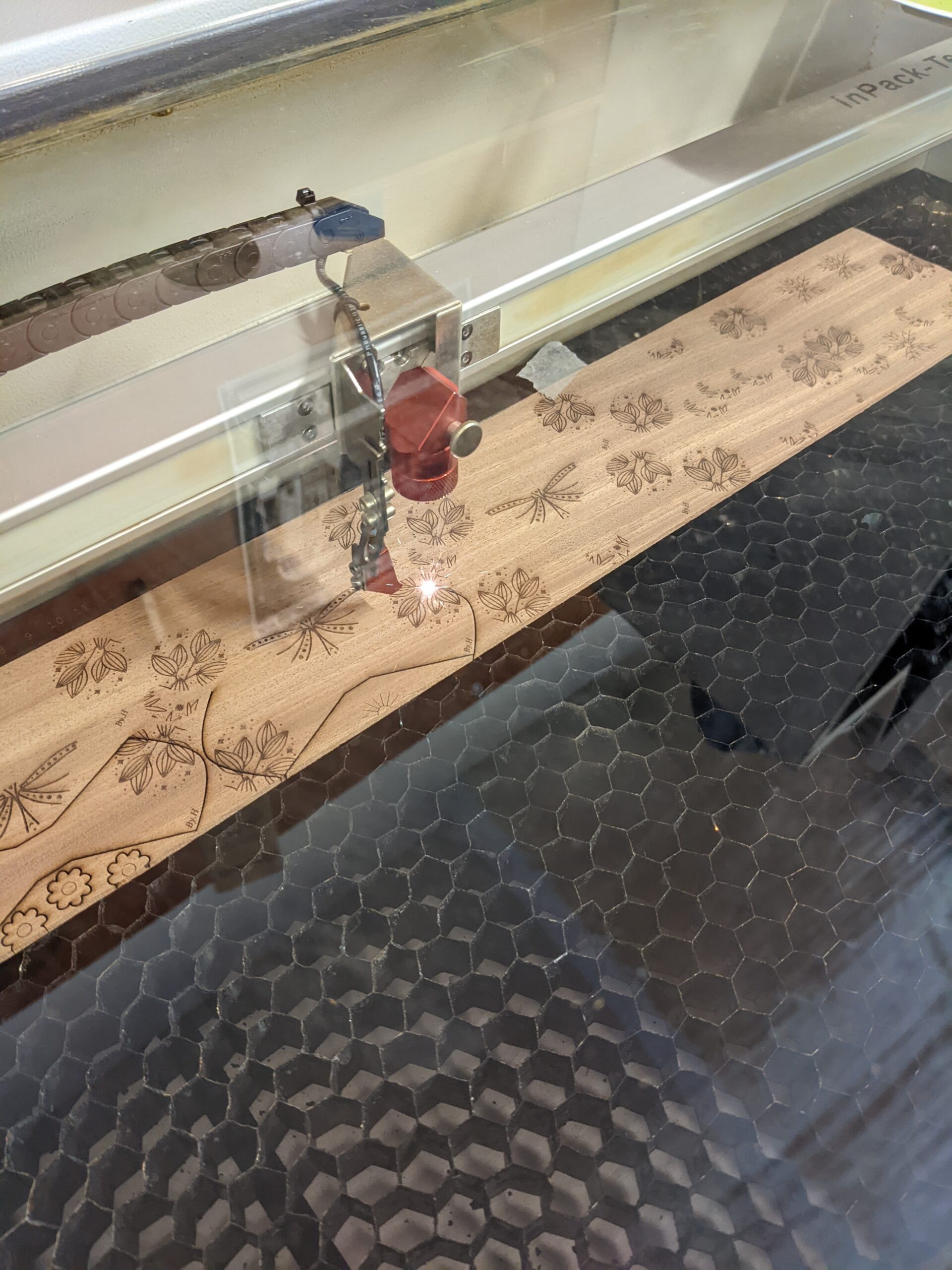 Le deuxième endroit où je travaille le plus est Le fab Lab Saint brieuc Factory. C’est un endroit de partage où il y a de nombreuses machines technique à dispositions, notamment la découpeuse et graveuse laser avec laquelle je fonctionne depuis plusieurs années. Là bas je programme mes designs sur un logiciel spécialisé avant de les découper et graver au laser sur diverses essences de bois.